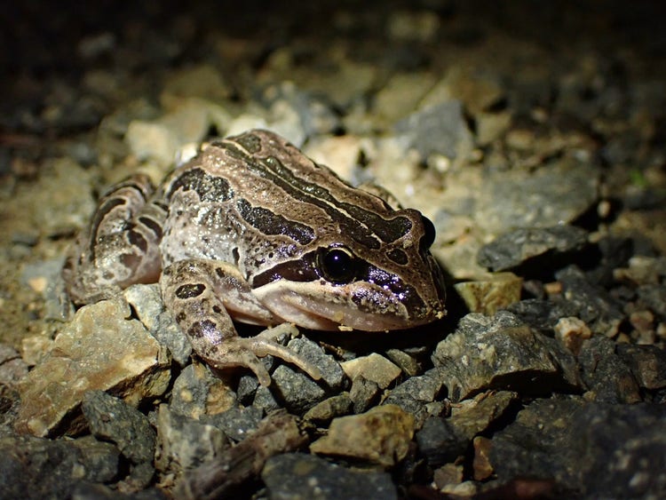 This species of frogs hide well in the undergrowth due to their brown, striped and spotted skin. These markings allow them to camouflage easily in their environment.