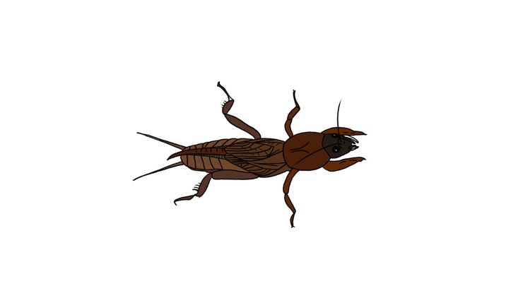 A burrowing insect with digging shovels on its front legs, found in soil and lawn areas.
